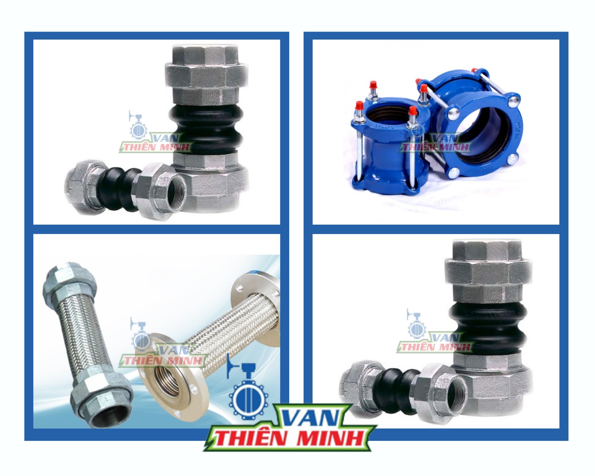 - Đa dạng mẫu mã và vật liệu: cao su, inox, gang, nối ren, nối bích.